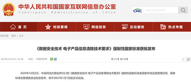 2025年12月2日,中央网信办提出并归口的《数据安全技术 电子产品信息清除技术要求》强制性国家标准由国家市场监督管理总局、国家标准化管理委员会批准发布,将于2027年1月1日起正式实施。