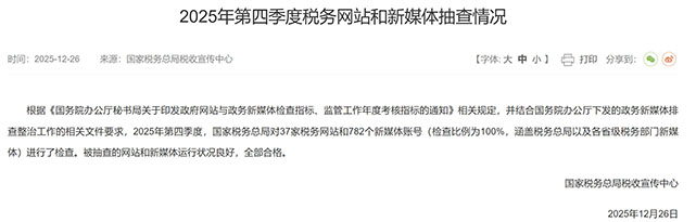 根据《国务院办公厅秘书局关于印发政府网站与政务新媒体检查指标、监管工作年度考核指标的通知》相关规定,并结合国务院办公厅下发的政务新媒体排查整治工作的相关文件要求,2025年第四季度,国家税务总局对37家税务网站和782个新媒体账号(检查比例为100%,涵盖税务总局以及各省级税务部门新媒体)进行了检查。被抽查的网站和新媒体运行状况良好,全部合格。