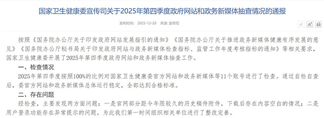 内容来源:国家卫生健康委宣传司/《国家卫生健康委宣传司关于2025年第四季度政府网站和政务新媒体抽查情况的通报》