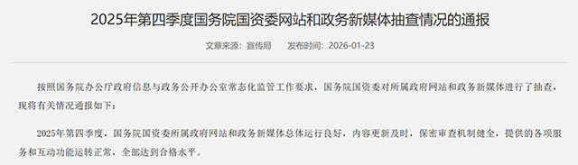 内容来源:国务院国资委宣传局/《2025年第四季度国务院国资委网站和政务新媒体抽查情况的通报》