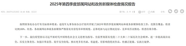 按照国务院办公厅有关标准和要求,退役军人事务部办公厅组织开展了2025年第四季度部属网站和政务新媒体检查工作,范围全覆盖,检查比例100%。经查,各部属网站和政务新媒体严格落实内容发布审核制度,总体更新与运行情况良好,无单项否决情况,检查结果合格。