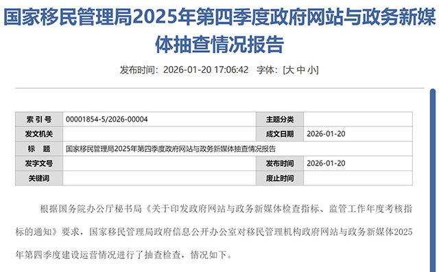 内容来源:国家移民管理局/《国家移民管理局2025年第四季度政府网站与政务新媒体抽查情况报告》