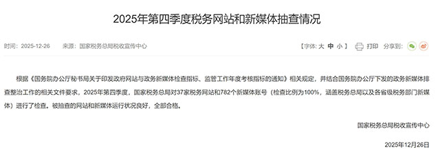 国家税务总局:2025年第四季度税务网站和新媒体抽查情况