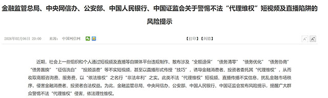 内容来源:《金融监管总局、中央网信办、公安部、中国人民银行、中国证监会关于警惕不法“代理维权”短视频及直播陷阱的风险提示》