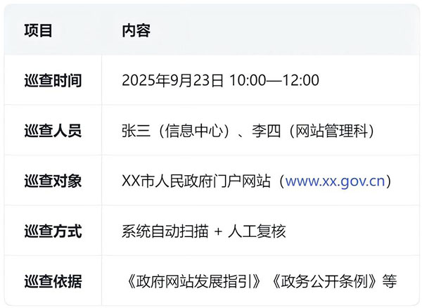 以下是关于“政府网站巡查记录表模板范文内容”的详细说明,并简要介绍“蚁巡系统”如何辅助该模板的生成与管理。