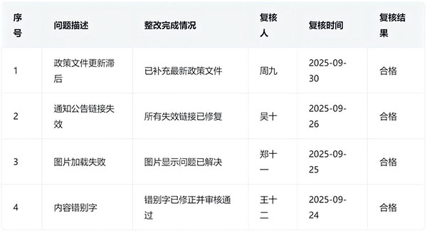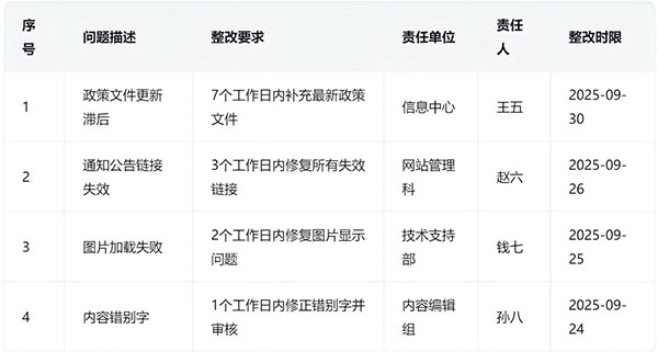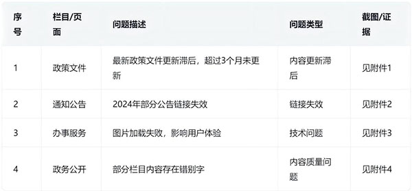系统自动对发现的问题进行分类(如内容更新滞后、链接失效、技术问题等),并生成详细的问题描述,便于直接填入记录表。