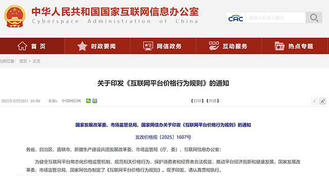 为健全互联网平台常态化价格监管机制,规范相关价格行为,保护消费者和经营者合法权益,推动平台经济创新和健康发展,国家发展改革委、市场监管总局、国家网信办制定了《互联网平台价格行为规则》。现予印发,请认真贯彻执行。