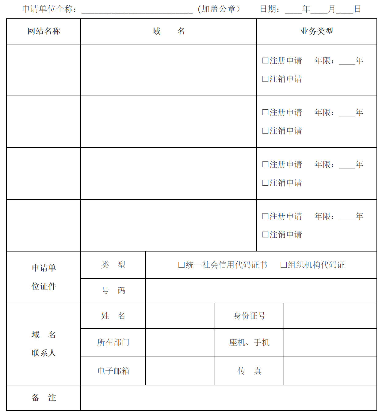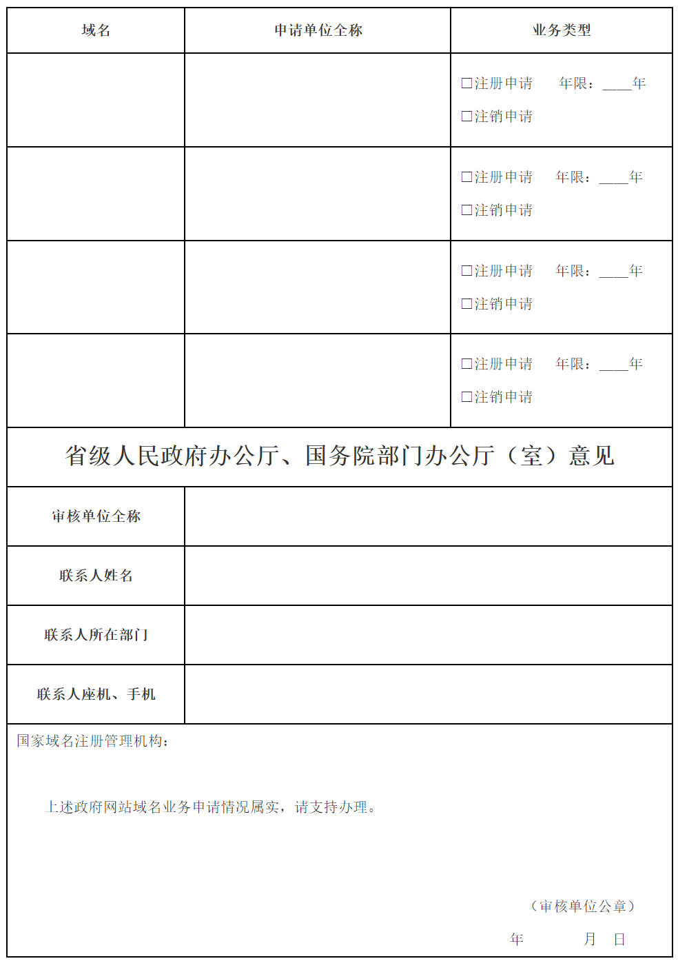 1.本表由申请注册或注销政府网站域名的单位填写,并加盖单位公章,单位全称须与公章保持一致。