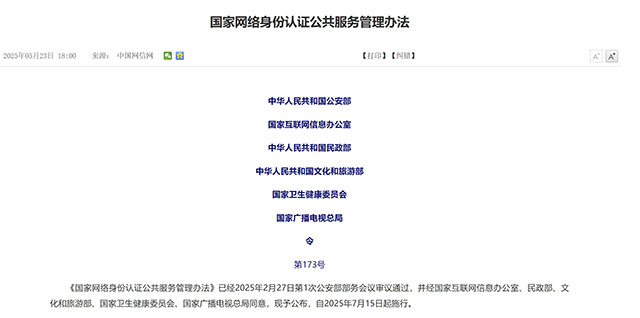 《国家网络身份认证公共服务管理办法》已经2025年2月27日第1次公安部部务会议审议通过,并经国家互联网信息办公室、民政部、文化和旅游部、国家卫生健康委员会、国家广播电视总局同意,现予公布,自2025年7月15日起施行。
