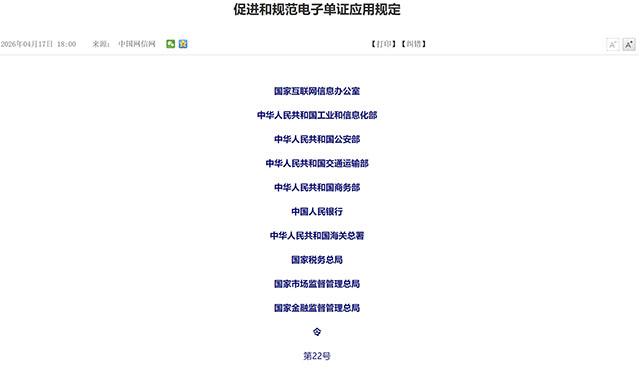 《促进和规范电子单证应用规定》已经2026年2月10日国家互联网信息办公室2026年第4次室务会会议审议通过,并经工业和信息化部、公安部、交通运输部、商务部、中国人民银行、海关总署、国家税务总局、国家市场监督管理总局、国家金融监督管理总局同意,现予公布,自2026年9月1日起施行。