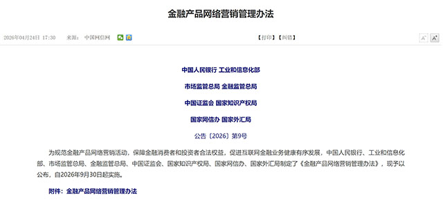 为规范金融产品网络营销活动,保障金融消费者和投资者合法权益,促进互联网金融业务健康有序发展,中国人民银行、工业和信息化部、市场监管总局、金融监管总局、中国证监会、国家知识产权局、国家网信办、国家外汇局制定了《金融产品网络营销管理办法》,现予以公布,自2026年9月30日起实施。